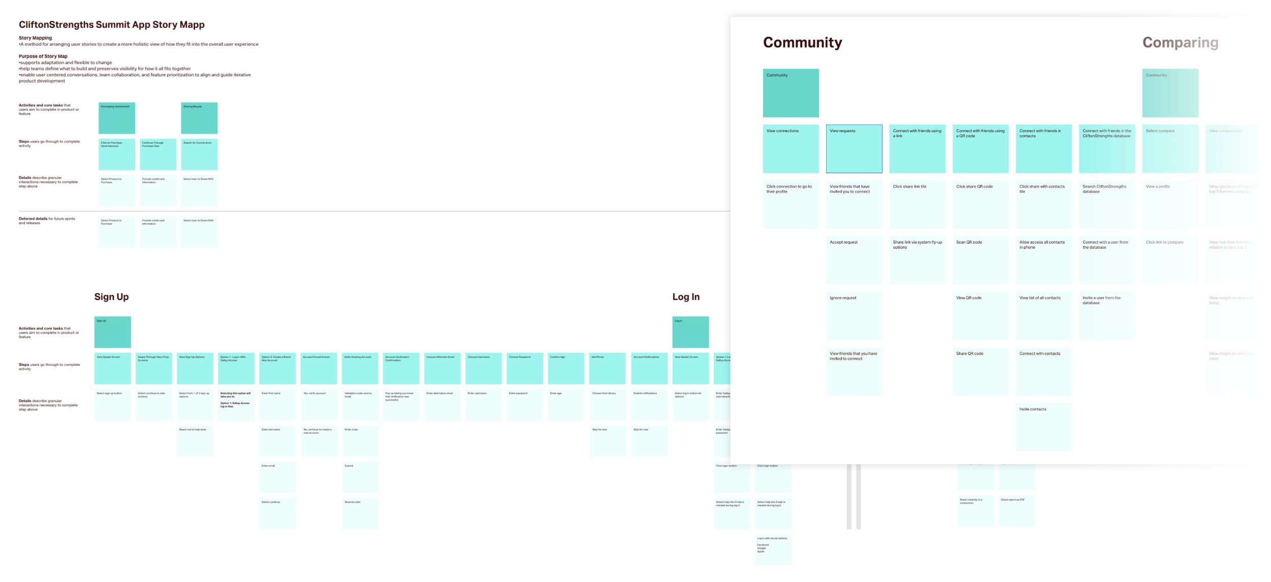 Once I had a solid understanding of user problems, I mapped the current experience using a story map. This helped me better understand the existing app structure and strategically integrate new concepts and solutions. The story map provided a high-level view of existing features and flows, while also offering a holistic perspective on how new and existing elements could work together within the overall user experience. It also served as a collaborative artifact that cross-functional partners and stakeholders could review and react to.
