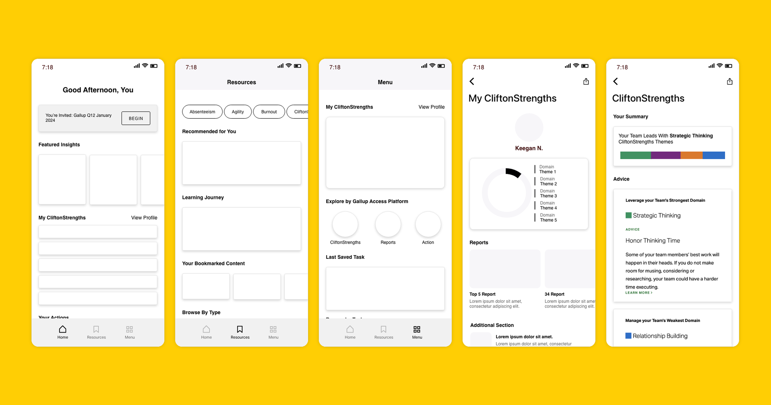 As we moved toward finalizing screens, one of our biggest challenges was determining how to integrate both enterprise and consumer experiences within the existing Gallup Access app. To address this, I proposed an updated navigation that simplified the app into three bottom tabs: the first tab serving as the main homepage for all Gallup Access products, the second tab providing a resources section accessible to every account holder, and the third tab dedicated specifically to CliftonStrengths and its features. I also mapped out the various combinations of products a user might have access to and created visuals showing how interface elements would adapt to each scenario. After much discussion, it was decided to keep the navigation as it and update the dashboard to make users more aware of the features.