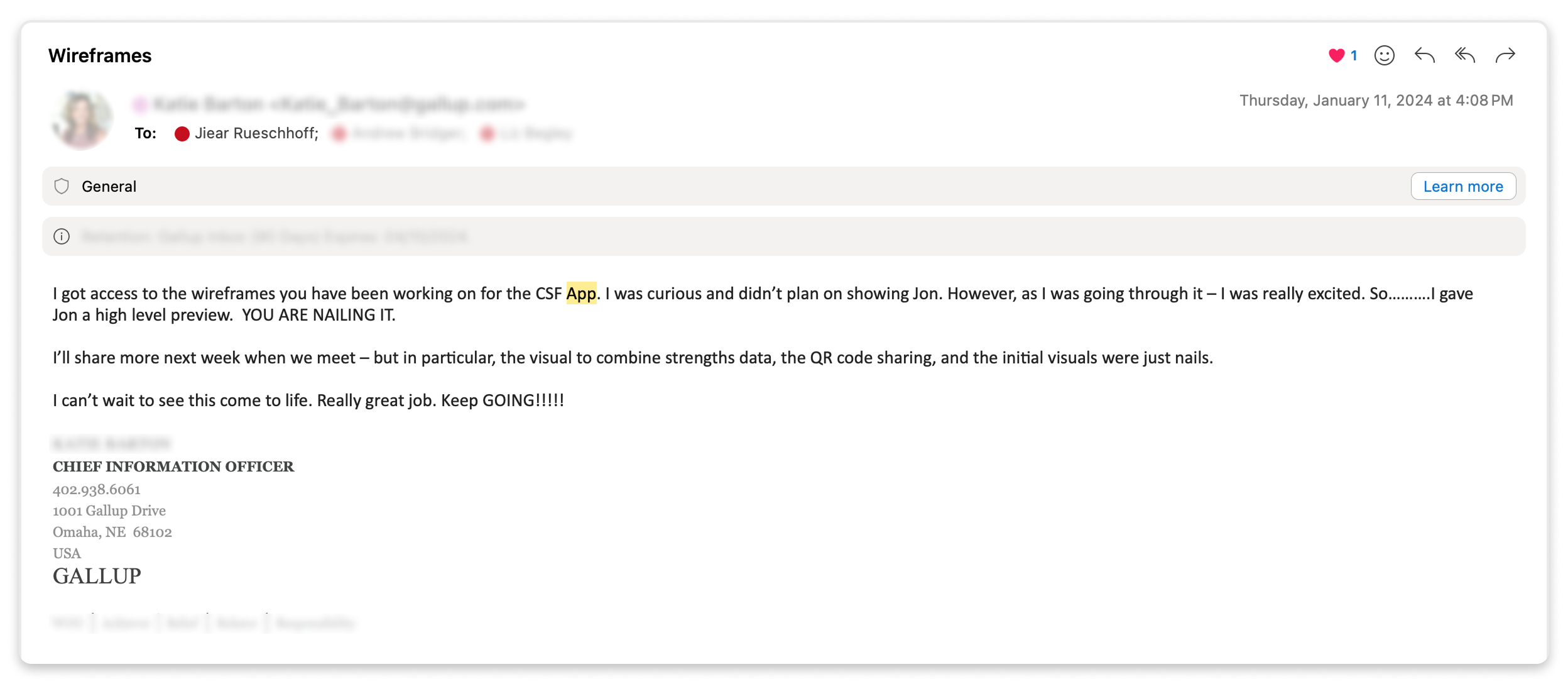 The team successfully executed the launch on schedule, delivering a standout moment for our CEO at Gallup’s annual Work Summit. The presentation was met with lots of praise and excitement from both the audience and our clients. It was a high-visibility moment that highlighted the strength of our work, the seamless coordination of the team, and our ability to create an impactful experience on a major stage.