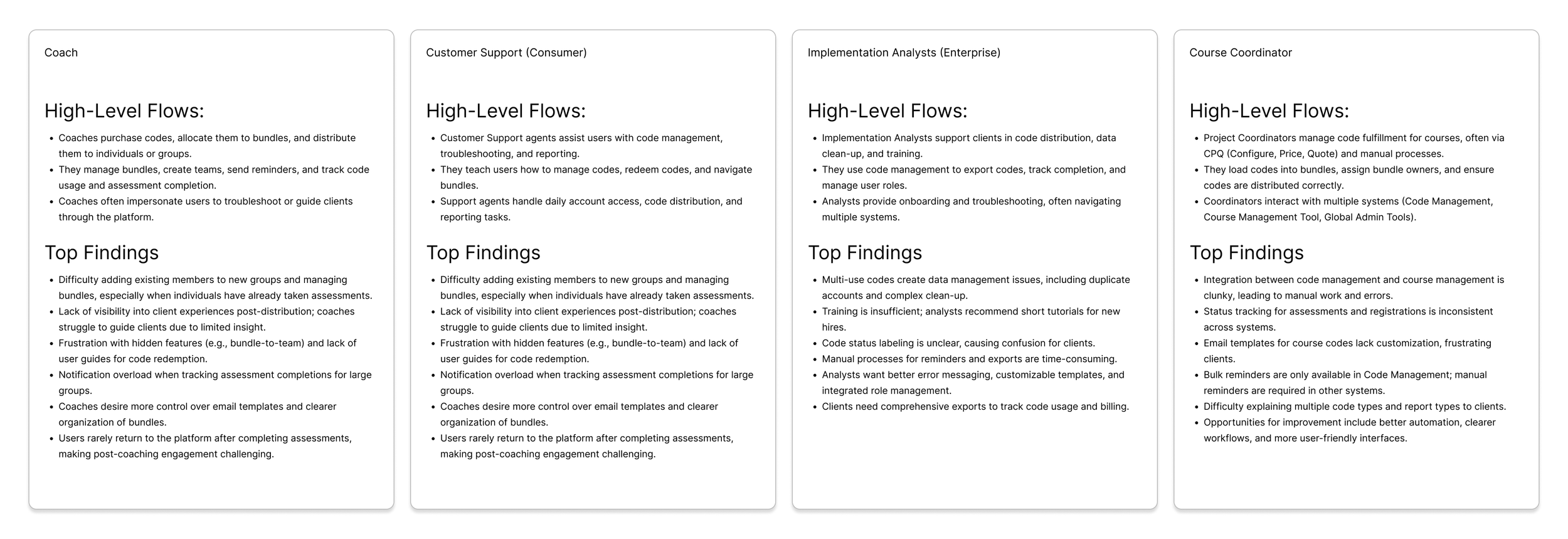 In addition to the research findings summary, I created a user journey maps for each of our 4 core user segments. The purpose of this was to understand the end-to-end flows each audience followed, identifying where their needs converged and where they diverged. This segmentation allowed me to map distinct tasks and workflows, clarify priority pain points, and ensure the redesigned system addressed both individual and enterprise-level complexity.