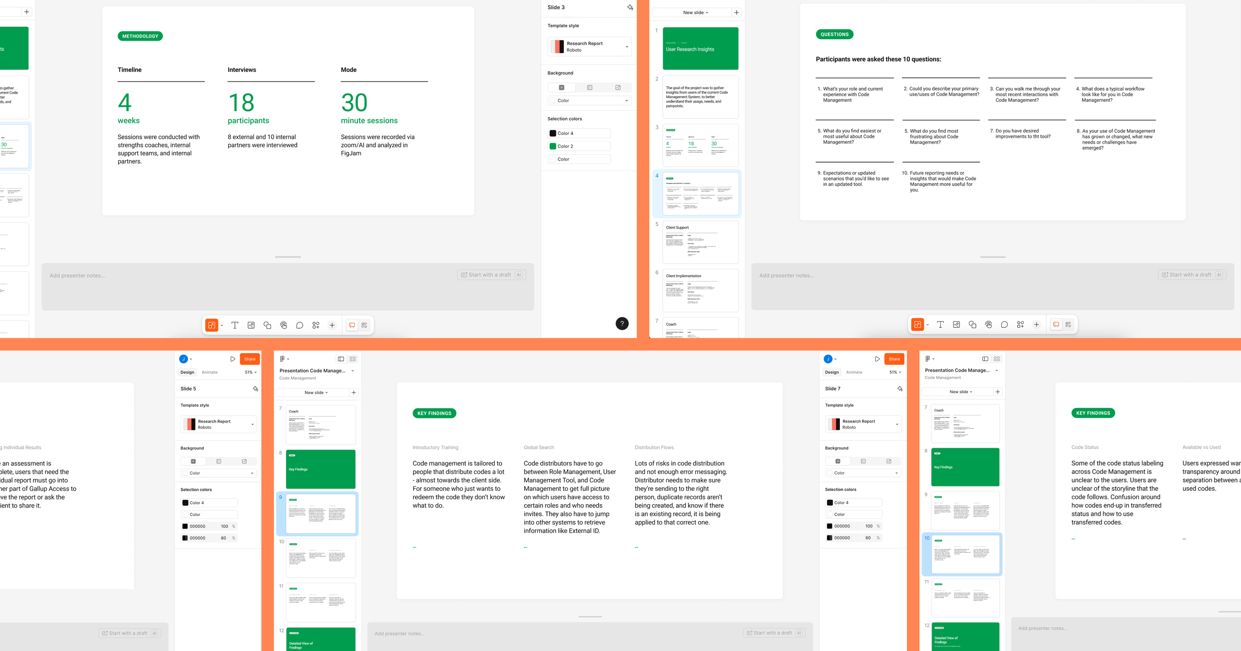 I combined the summary of findings into a single powerpoint that I shared across the team and larger department. Within that powerpoint, and in an effort to give others a view into how the design team structures user interviews, I provided information on the methodology, questions and key findings. Key findings from the users interviews emerged around users wanting more tutorials, wanting, pain points around user, code, and assessment management, lack of error messaging, status labels, more comprehensive exports and usage reports, email management features, creating bundles from teams, and gettin individual results.