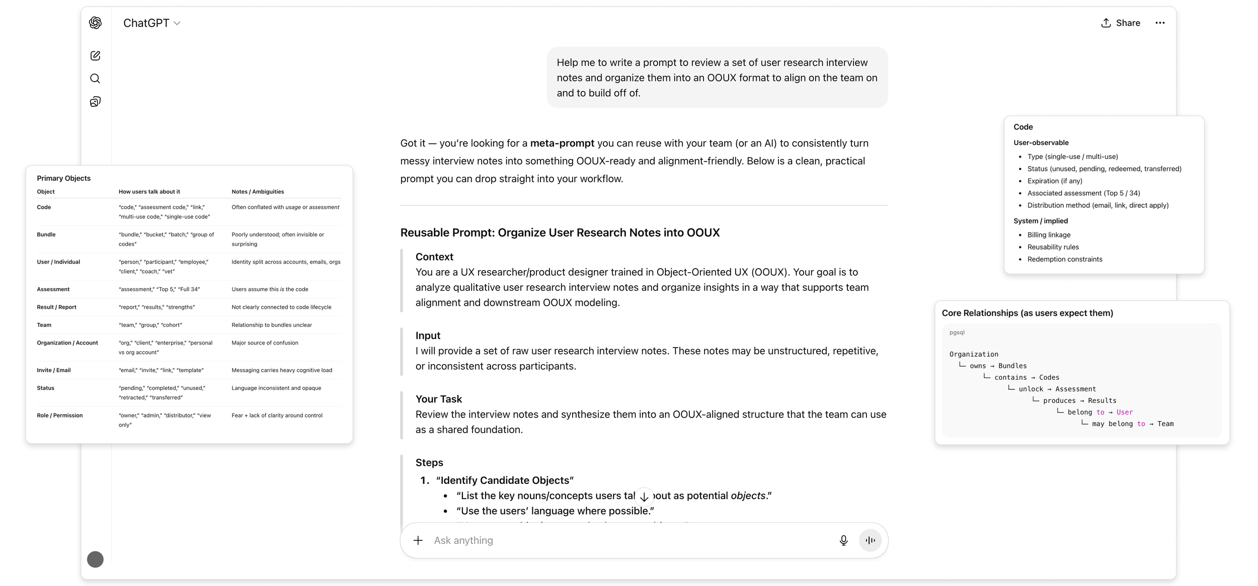 Now that the team and I had alignment on the users, their journey through the system, and their biggest pain points I started discovery exploration on the platform and existing tooling. As I worked to understand the system and its core components, I conducted an initial pass at defining an object-oriented UX model. Using insights from user interviews, I used ChatGPT to synthesize recurring patterns and behaviors into simplified, reusable objects and relationships. This helped me to distill complexity across the platform and created a clearer foundation for structuring features, interactions, and system logic moving forward.